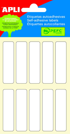 Samolepící etikety, obdélníkový tvar. Rozměr 13 x 50 mm. Permanentní. Malé balení v blistru, 60 ks, 6 listů.
