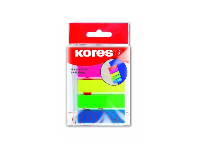 Neonové záložky Kores Index Strips 45x12 mm / 5 barev / 25 lístků á barva - malé barevné záložky vhodné k označení potřebné stránky. Nalepovací záložky mohou bez problému nahradit barevný rozřaďovač.