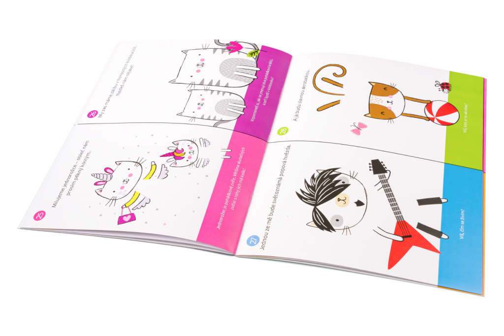 Pojmenujte roztomilé kočičky, vyberte správné samolepky a oblékněte je podle toho, co mají rády nebo čemu se věnují. A nezapomeňte zodpovědět naše otázky! Pokud si snad nebudete vědět rady, nic se neděje: v knížce najdete i správné odpovědi. Až z vás budou kočičí odborníci, můžete si nakreslit vlastní zvířátko a doplnit jeho obrázek vším, co potřebuje, aby bylo mezi ostatními spokojené. Třeba i nějakou záludnou otázkou a správnou odpovědí!