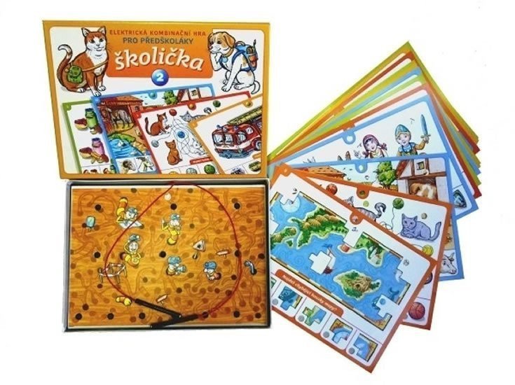 Školička je elektrická kombinační hra pro předškoláky. Obsahuje 16 listů s mnoha obrázky, mezi nimiž děti hledají souvislosti. Správnost odpovědi signalizuje elektronický zkoušecí obvod rozsvícením zeleného světýlka. Hra učí děti všímat si vztahů a logických souvislostí mezi obrázky, porovnávat je a správně je k sobě přiřazovat. Na baterie, v krabici 22 x 16 x 3 cm. Vhodná od 4 let.