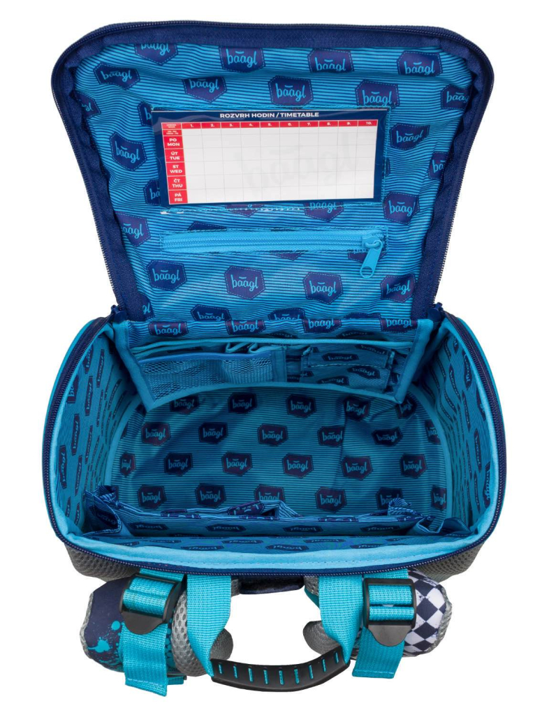 • Uvnitř aktovky je průhledná kapsa s rozvrhem a vnitřní organizér umožňující rovnoměrné rozložení hmotnosti, doplněný gumičkou pro fixaci.