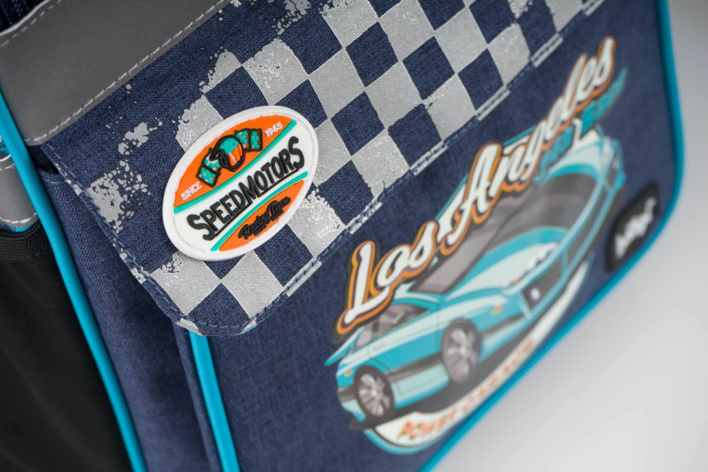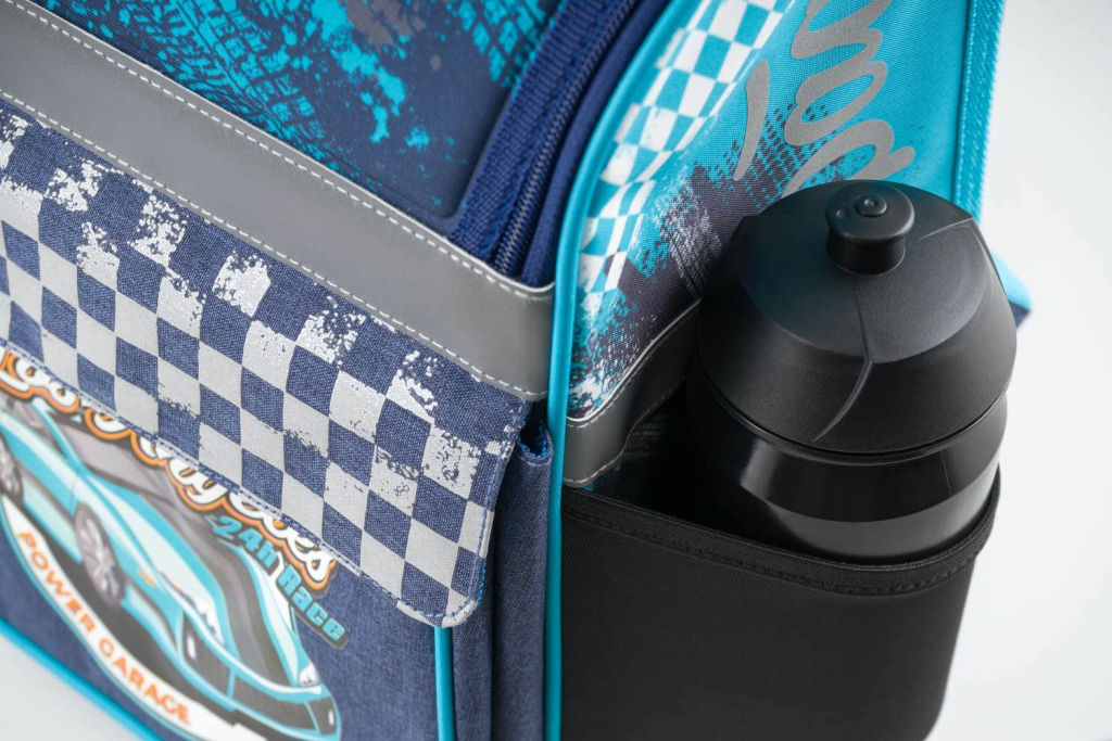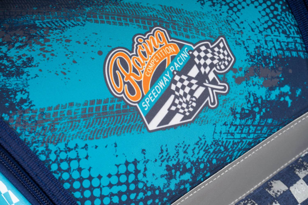 Školní aktovka Zippy Racer s motivem závodního auta na přední části, vhodná pro žáky 1.–2. třídy ZŠ. Aktovka byla úspěšně testována v ITC Zlín.