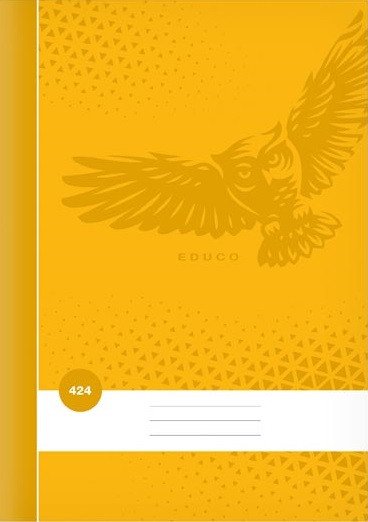 Školní linkovaný sešit ve formátu A4, ve žluté barvě, s motivem sovy, v deskách z křídového papíru.
