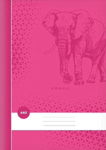 Školní sešit čistý, bez linek ve formátu A4, v malinové barvě, s motivem slona, v deskách z křídového papíru.