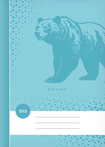 Školní linkovaný sešit ve formátu A5, v tyrkysové barvě, s motivem medvěda, v deskách z křídového papíru.