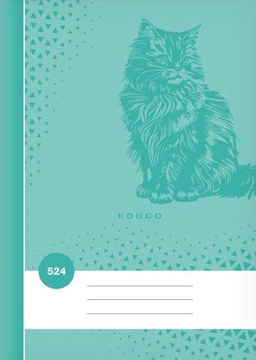 Školní linkovaný sešit ve formátu A5, v zelené barvě, s motivem kočky, v deskách z křídového papíru. Stránky jsou opatřeny okraji o šířce 2 cm.