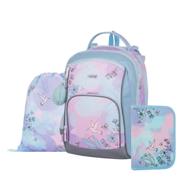 Školní batoh OXY GO zaujme moderním designem a promyšlenou funkčností. Má anatomicky tvarovaná, prodyšná záda a nastavitelné ramenní popruhy pro pohodlné nošení. Přidané háčky umožňují uchycení dlouhých popruhů. Vnitřní kapsy nabízí dostatek místa na učebnice, sešity i další potřeby, pevné nepromokavé dno chrání obsah před ušpiněním a protečením. Boční kapsy, jedna na zip a jedna otevřená, slouží např. na láhev. Reflexní prvky zajišťují bezpečnost. Batoh je ideální pro děti od 1. do 3. třídy vysoké od 125 cm. Délka zádového panelu je 39 cm, objem 22 l, hmotnost 930 g, nosnost 8 kg. Sáček: Praktický na cvičky nebo volnočasové aktivity, uzavírá se šňůrkami. Penál: Jednopatrový se dvěma chlopněmi, poutka na psací potřeby a průhledná fólie na rozvrh hodin.