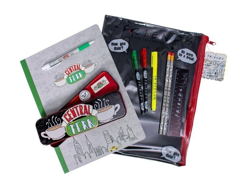 Velý školní set pro fanoušky seriálu Přátelé. Balení obsahuje kovový penál, blok A4, sadu propisek, tužky, zvýrazňovač a pravítko. Vše baleno v transparentním pouzdro pro opakované využití.