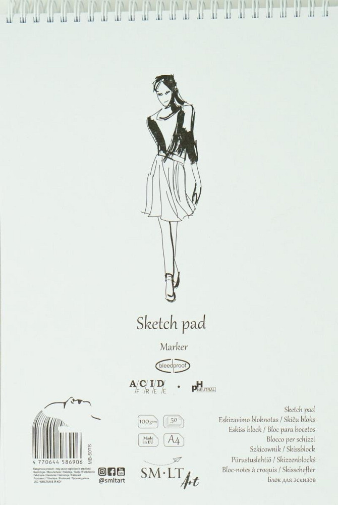 Blok s bílým, jednostranně nepropustným potahovaným papírem, 100g/m2. Povrch je hladký a je vhodný zejména pro popisovače a gelová pera. S přírodním kartonovým obalem, pevnou zadní stranou a spirálou na horní straně. Vnitřní papír je bez kyselin, pH neutrální a má certifikát FSC.