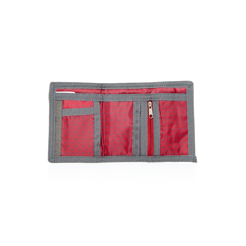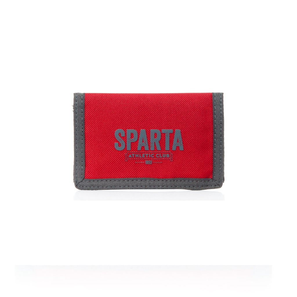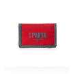 Peněženka rudé barvy s nápisem Sparta. Peněženka obsahuje praktické uzavírání na suchý zip, uvnitř přihrádky na bankovky, karty a kapsa na mince na zip.