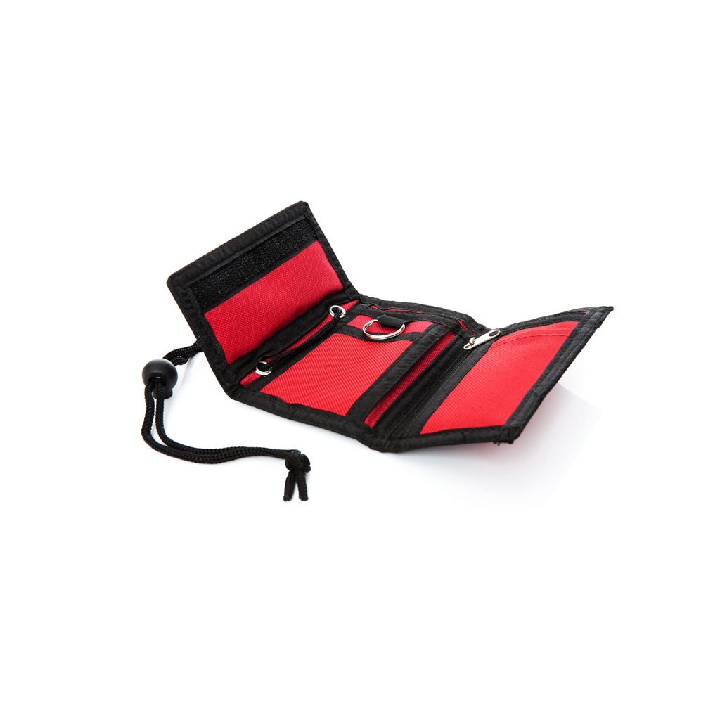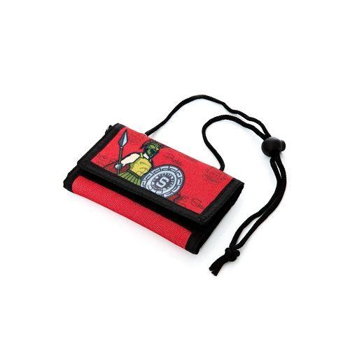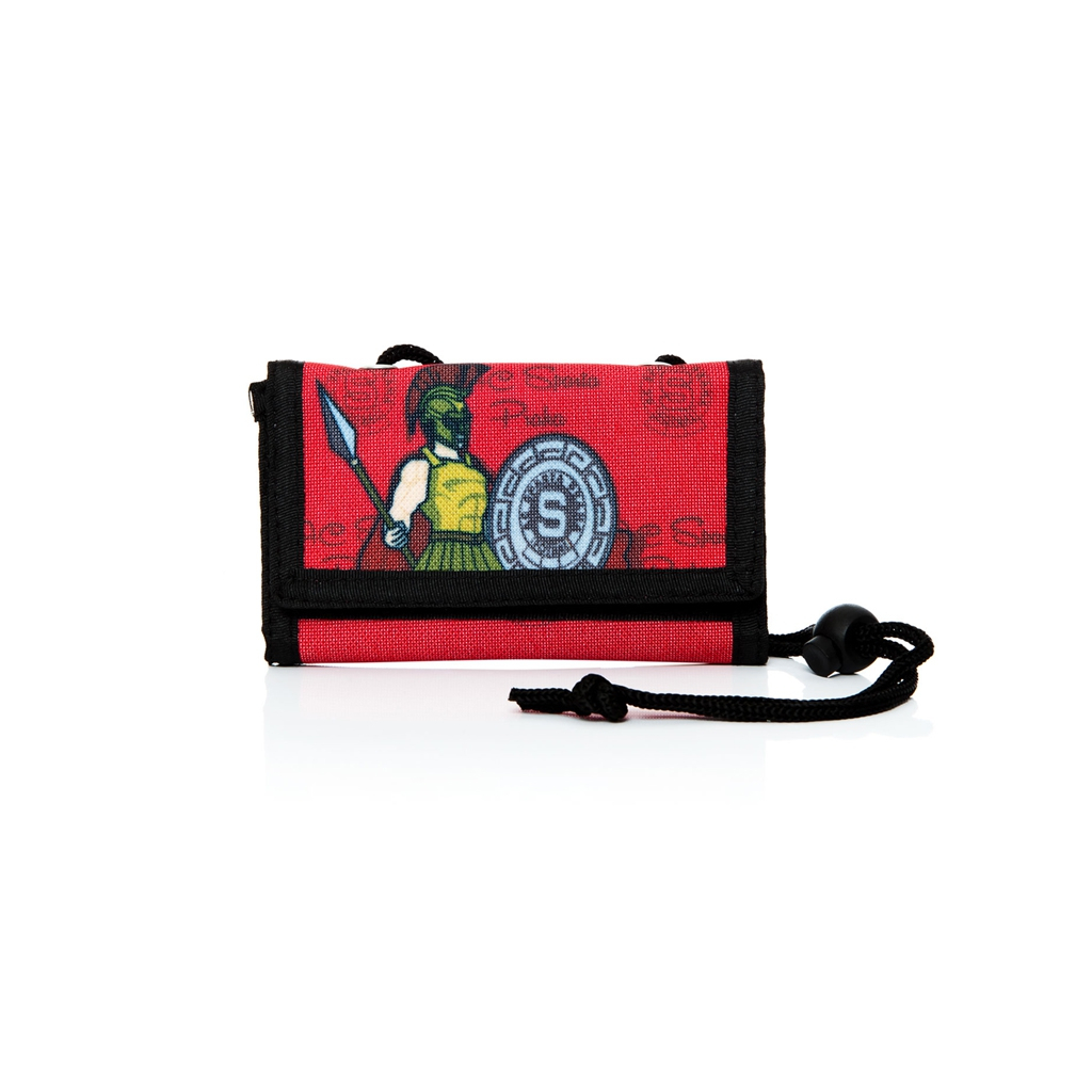 Dětská textilní peněženka s potiskem SPARŤAN. Praktické uzavíraní na suchý zip, uvnitř přihrádky na bankovky, karty a kapsa na mince na zip, peněženka je opatřena šňůrkou pro nošení na krku.