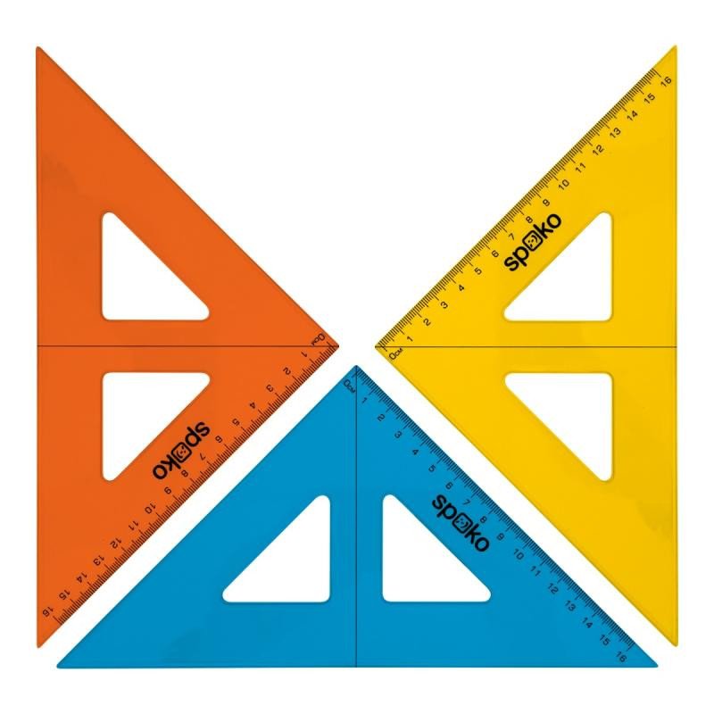 Rovnoramenný pravoúhlý trojúhelník s ryskou a předtištěnou stupnicí o délce 16 cm. Pravítko svírá úhly 45°/90°/45°. • měřítko: 16 cm • materiál: pevný a odolný polystyren • předtištěná ryska a stupnice • mix barev: žlutá, modrá, oranžová