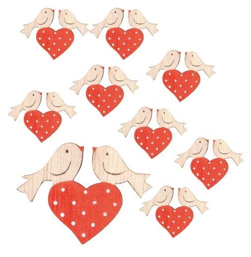 Srdíčko s ptáčky s lepíkem dřevěné 4 cm, 24 ks v krabičce