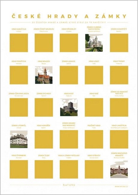 Stírací plakát ve formátu A3 udělá radost každému milovníkovi historie. 25 stíracích políček ukrývá originální ilustrace, které vás zavedou na TOP 25 hradů a zámků v Česku, například na zámek Lednice, Pražský hrad nebo legendární Karlštejn. Plakát slouží jako hravá motivace nebo seznam nápadů na výlety po Česku. Stírací plakát zasíláme v krabičce s ochranným papírem, aby se k vám dostal bez jakéhokoliv poškození. br br Se stíracím plakátem TOP 25 českých hradů a zámků budete mít o nápady na výlety po Česku postaráno. Pod 25 stíracími políčky na vás čekají moderní ilustrace těch nejkrásnějších českých hradů a zámků. Navštivte jednotlivá místa na stíracím plakátu a svou návštěvu zaznamenejte setřením stíracího políčka – na památku či oslavu dalšího objeveného místa.