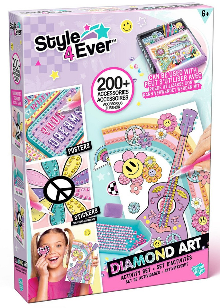 Objevte zábavné tvoření s diamantovým malováním Style4Ever! Tento kreativní set obsahuje 2 archy samolepek pro diamantové kamínky, více než 2500 ks barevných kamínků, aplikátor/pero, tácek, vosk a organizér na kamínky. Diamantové malování je ideální pro děti od 6 let, podporuje rozvoj jemné motoriky, kreativity a koncentrace. Perfektní zábava na dlouhé hodiny pro malé umělce!