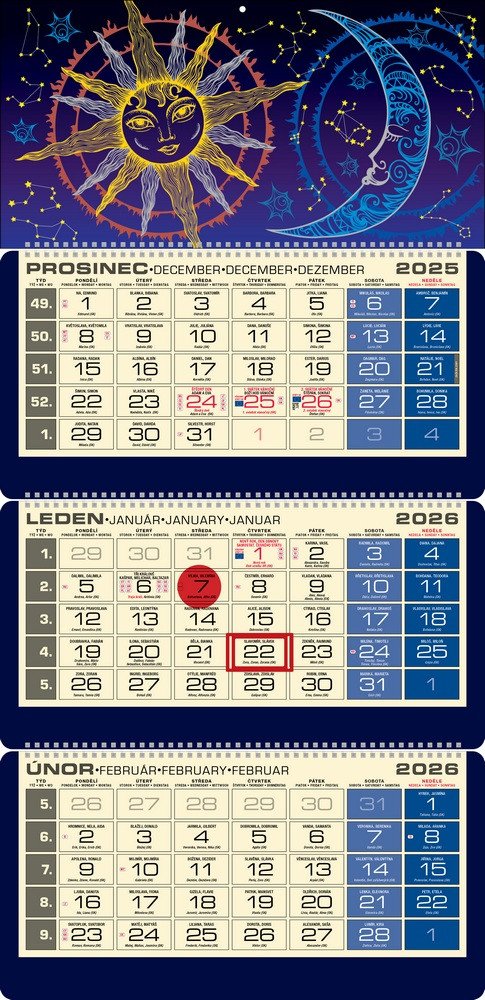 Design s lunárním motivem se zlatou i stříbrnou ražbou doplněný 3D lakem. Luxusní tříměsíční kalendář se jmény v CZ a SK, názvy měsíců a dnů ve čtyřech jazycích, praktickým označovačem a přehledem svátků EU.