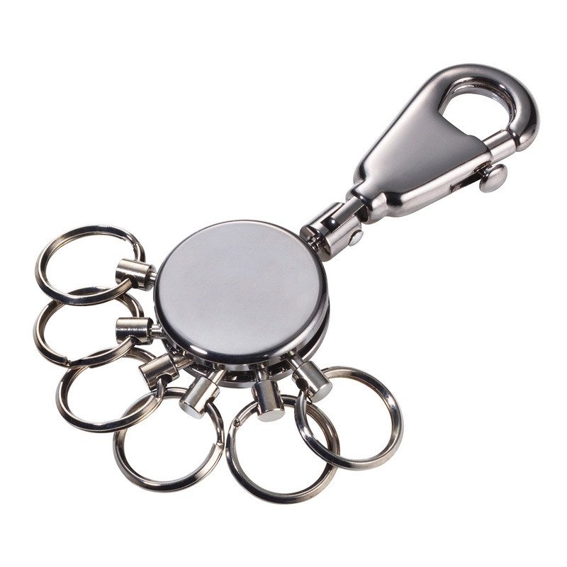 Kulatá klíčenka ve tvaru karabinky a s 6 kusy odnímatelných kroužků, díky kterým máte organizaci klíčů stále pod kontrolou. Stříbrné provedení.