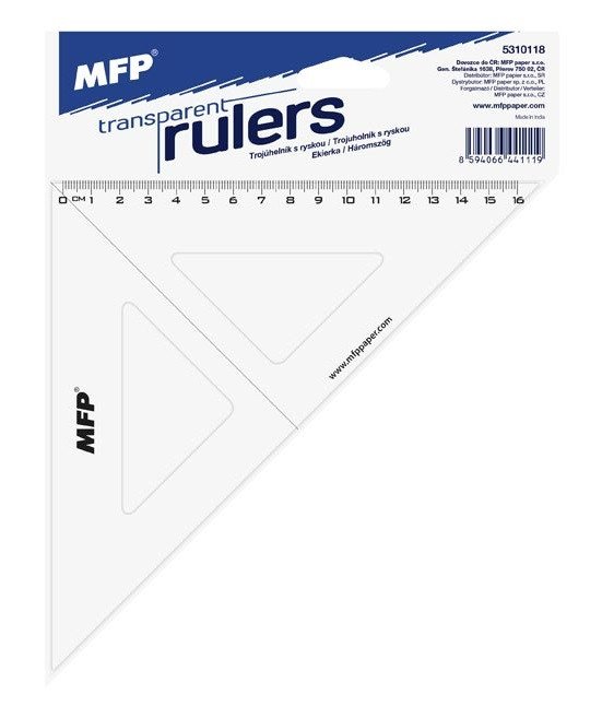 Školní plastové pravítko pravoúhlý trojúhelník s ryskou o délce 16 cm. Pravítko svírá úhly 45°/90°/45°.