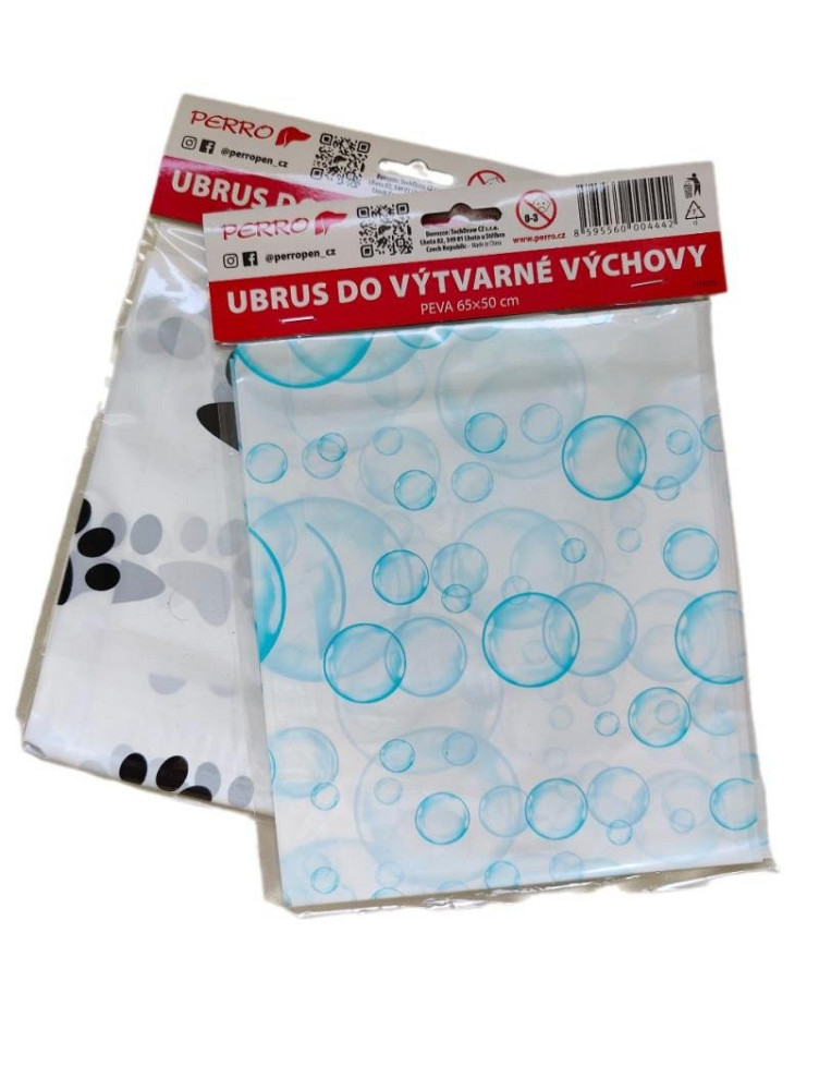 Ochranný ubrus na lavici, materiál PEVA, rozměr 65 x 50 cm, mix designů: černé tlapky a modré bublinky.
