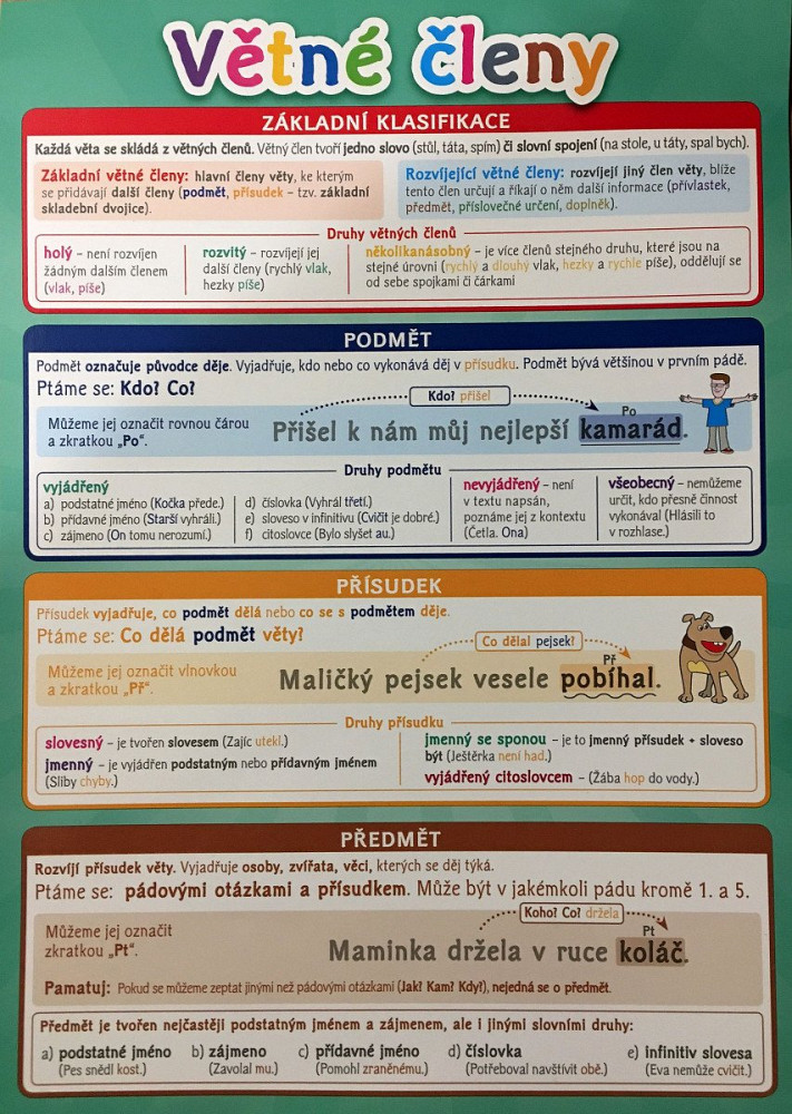 S tímto přehledem Větných členů zvládneš češtinu hravě. Základní členění - Podmět - Přísudek - Předmět - Přívlastek - Příslovečné určení - Doplněk s vysvětlením a příklady. A4 formát