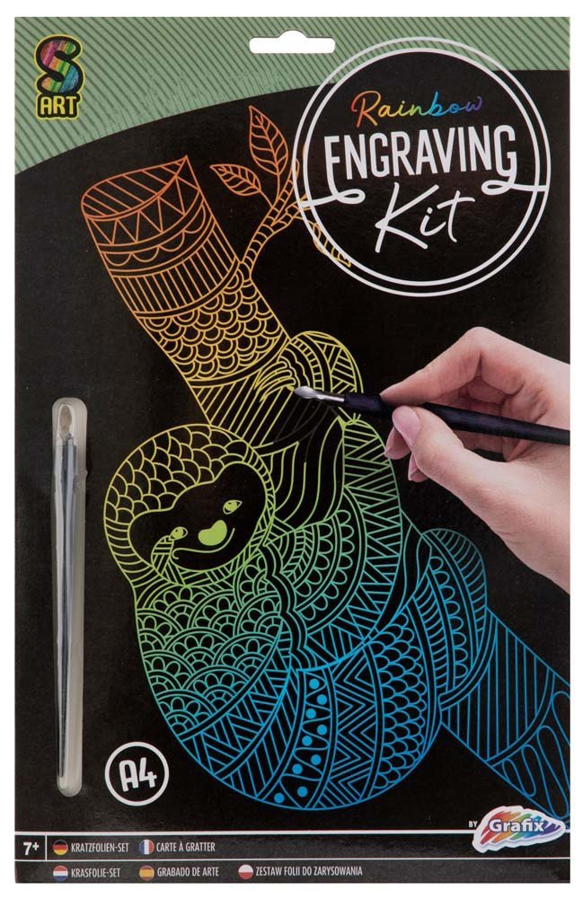 Sada obsahuje obrázek lenochoda natištěný na černém kartonu, škrabací pero a vzorek na vyzkoušení. Po seškrábání kontury předtištěného obrázku se objeví krásný duhový rytinový obrázek.
