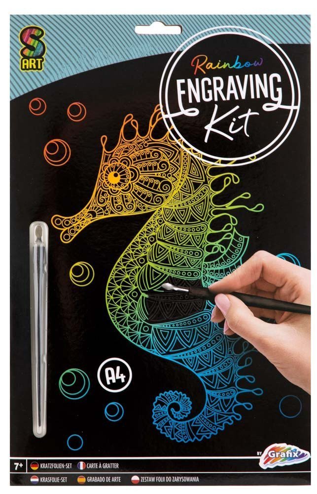 Sada obsahuje obrázek mořského koníka natištěný na černém kartonu, škrabací pero a vzorek na vyzkoušení. Po seškrábání kontury předtištěného obrázku se objeví krásný duhový rytinový obrázek.