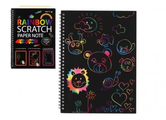 Kreativně se vydovádějte na vyškrabovacím notesu. Na jednotlivých listech můžete pomocí vyškrabovacího pera vytvářet různé pestrobarevné obrázky. Balení obsahuje notes 10 listů + vyškrabovací tyčinku. Rozměr notesu: 19 x 26 cm Vhodné od 3 let