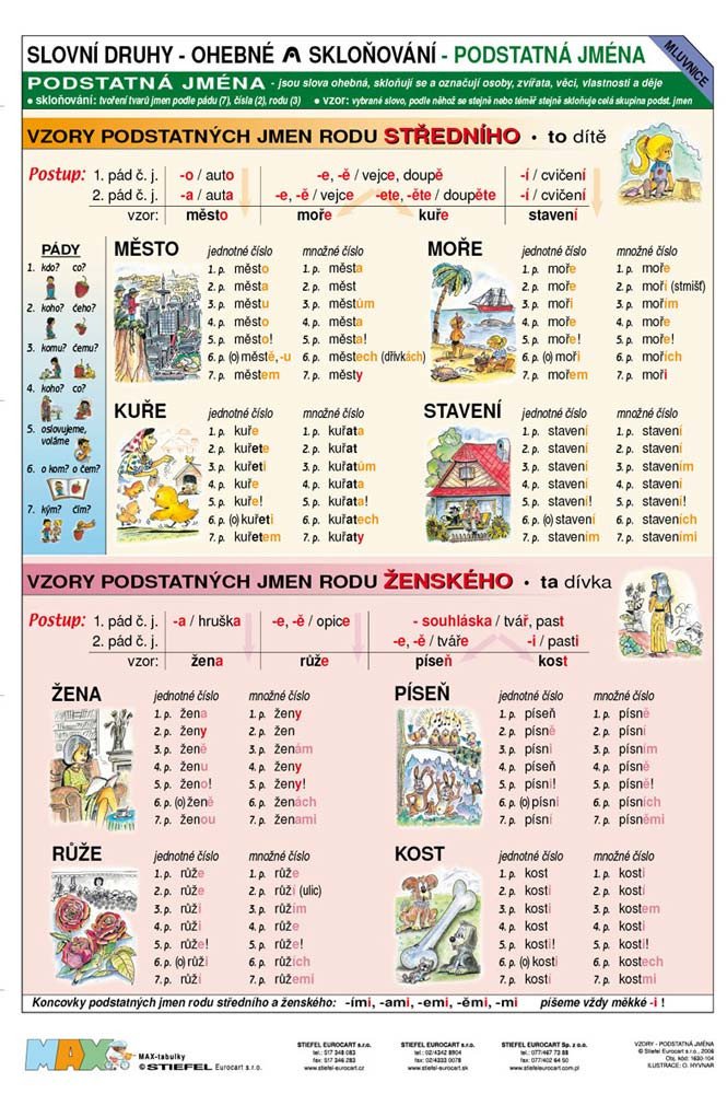Naučná tabulka skloňování vzorů podstatných jmen pomáhá žákům při práci s gramatickými kategoriemi podstatných jmen. Oboustranný produkt, na každé straně je samostatné téma.