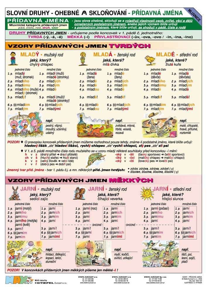 Podstatnou složku této didaktické pomůcky tvoří skloňování vzorů přídavných jmen a způsob přiřazení ke gramatické kategorii přídavných jmen. Obrázky jsou motivovány daným vzorem, jeho gramatickou charakteristikou, mají povzbuzovat žáky k vyhledávání, tvorbě dalších a podobných přídavných jmen. Na konci tabule je stručný přehled stupňování přídavných jmen. Oboustranný produkt, na každé straně je samostatné téma.