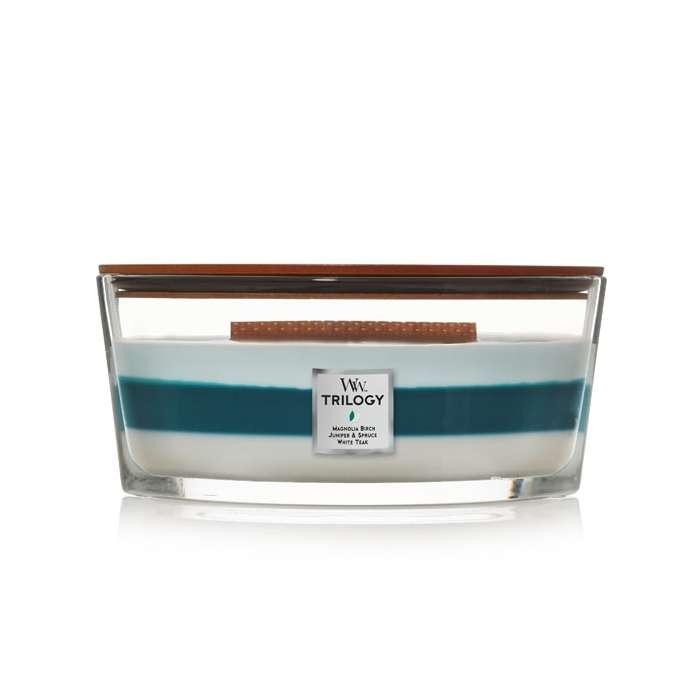 WoodWick Icy Woodland svíčka loď Trilogy 453,6g