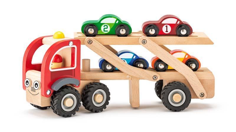 Tahač, návěs i auta jsou vyrobeny z tvrdého masivního dřeva. Patrová plošina pro auta se dá sklopit tak, aby auta mohla najet a zase sjet z rampy. Tahač a návěs se dají odpojit. Balení obsahuje: tahač, návěs a 4 auta. Rozměr: 27 x 8 x 11 cm | Věk: 3+