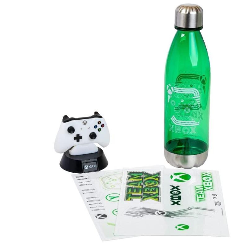 Krásný dárkový set pro fanoušky konzole XBOX. Obsahuje: světlo, lahev a samolepky. Světlo v podobě ovladače funguje na 2x AAA baterie, které nejsou součástí balení. Oficiálně licencováno. Lahev má objem 680 ml a není vhodná na horké nápoje. Materiál lahve: plast. Dále obsahuje 2x samolepky.