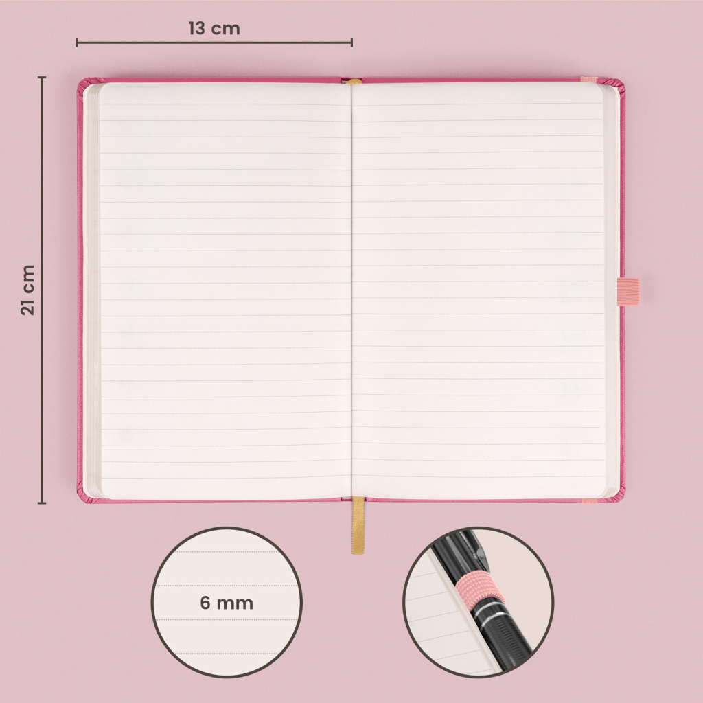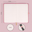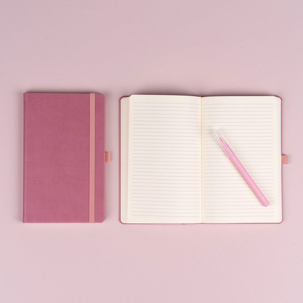 Praktický a lehký linkovaný notes v trendy růžové barvě má povrch s jemnou strukturou, na který si můžete nechat vyrazit logo společnosti. Notes má pevnou knižní vazbu a zakulacené rohy, poutko na tužku, elastickou gumičku a textilní záložku. Linky mají 6 mm a jsou na kvalitním žlutém papíře.