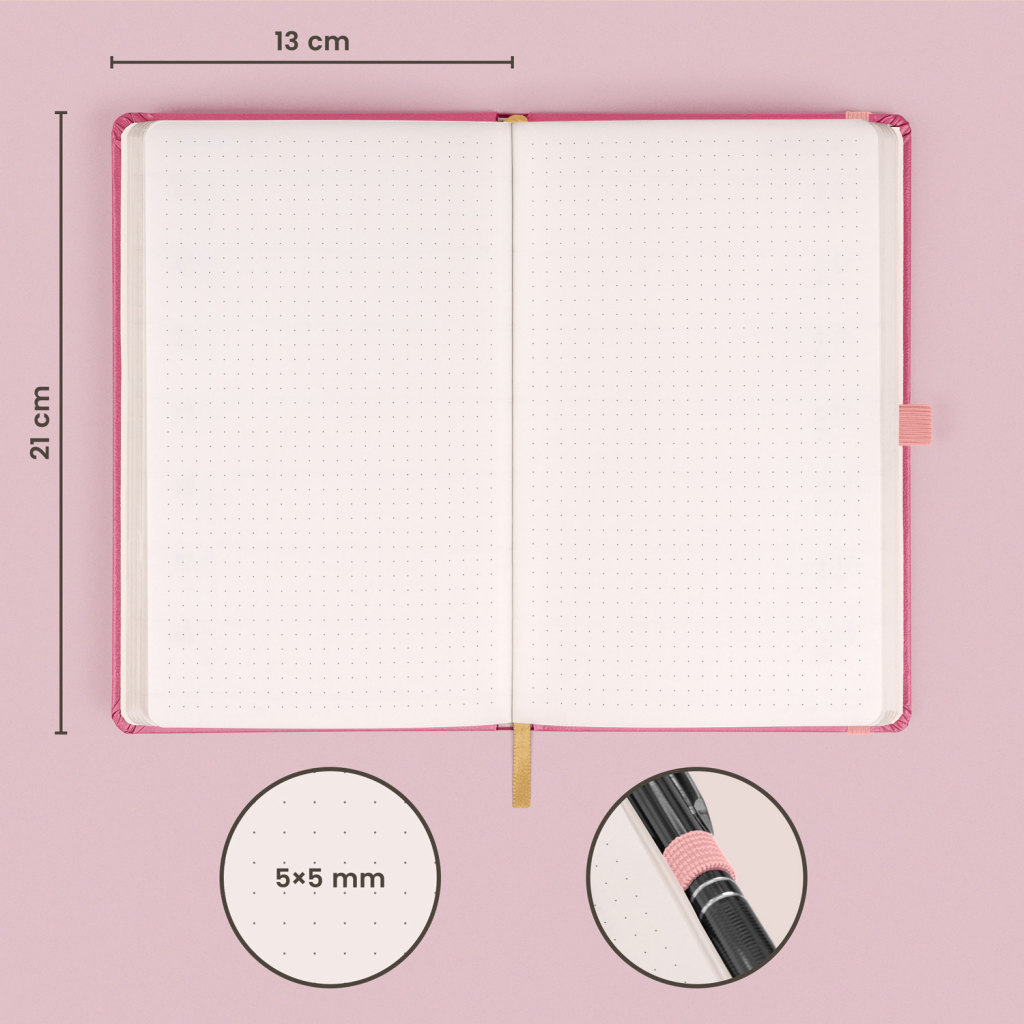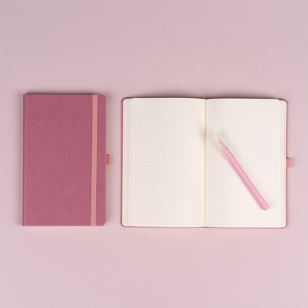 Praktický a lehký tečkovaný notes v trendy růžové barvě má povrch s jemnou strukturou, na který si můžete nechat vyrazit logo společnosti. Notes má pevnou knižní vazbu a zakulacené rohy, poutko na tužku, elastickou gumičku a textilní záložku. Tečky mají 5 mm a jsou na kvalitním žlutém papíře.