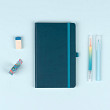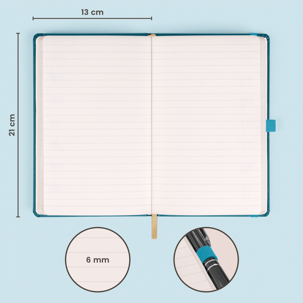Praktický a lehký linkovaný notes v trendy tyrkysové barvě má povrch s jemnou strukturou, na který si můžete nechat vyrazit logo společnosti. Notes má pevnou knižní vazbu a zakulacené rohy, poutko na tužku, elastickou gumičku a textilní záložku. Linky mají 6 mm a jsou na kvalitním žlutém papíře.