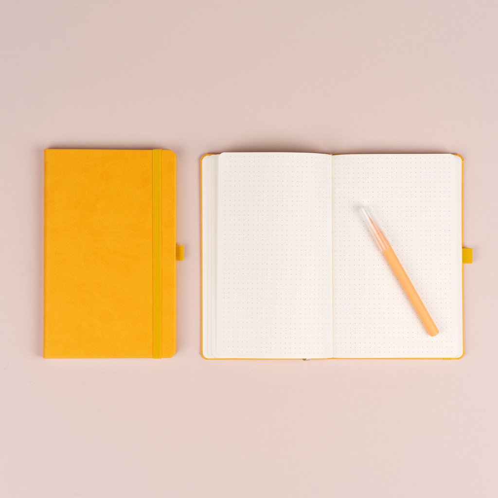 Praktický a lehký tečkovaný notes v trendy žluté barvě má povrch s jemnou strukturou, na který si můžete nechat vyrazit logo společnosti. Notes má pevnou knižní vazbu a zakulacené rohy, poutko na tužku, elastickou gumičku a textilní záložku. Tečky mají 5 mm a jsou na kvalitním žlutém papíře.