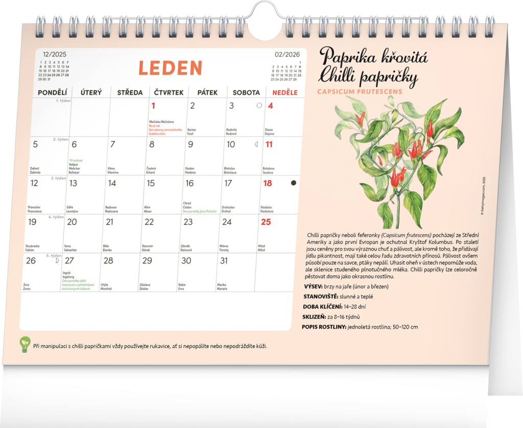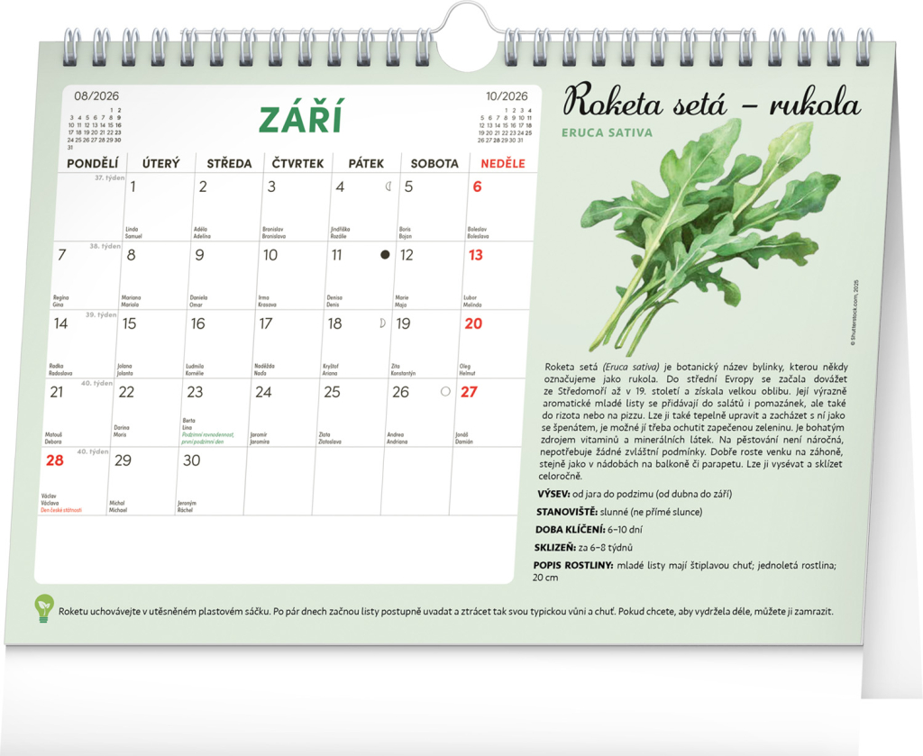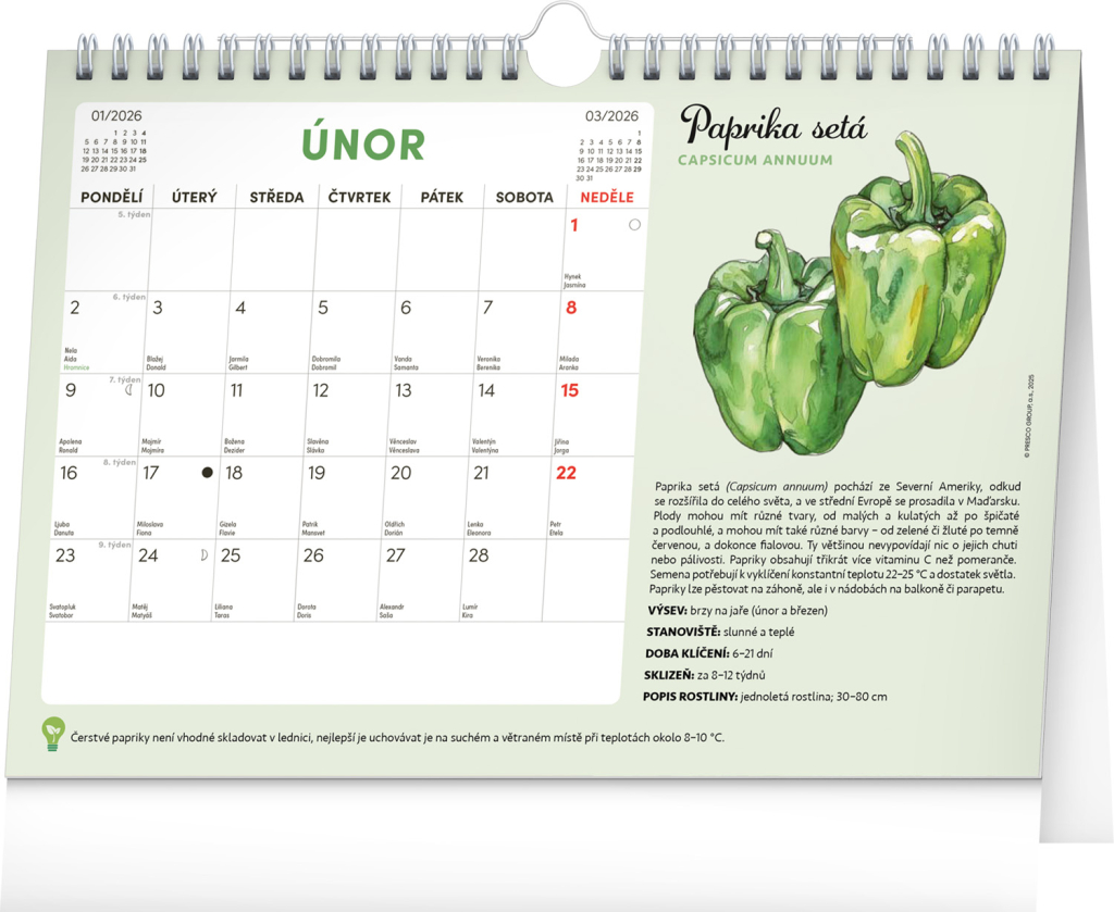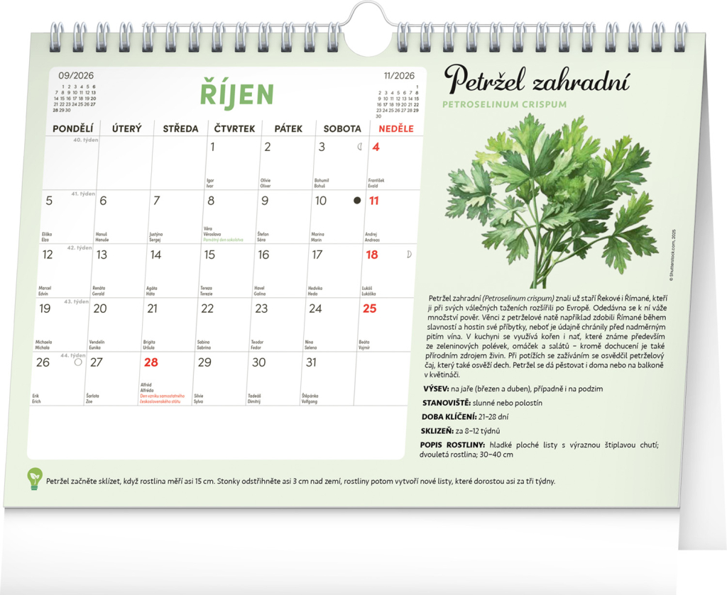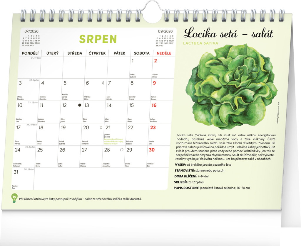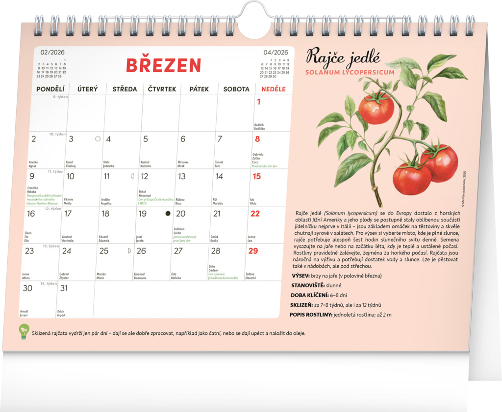 Objevte jedinečný stolní kalendář, který vám každý měsíc nabídne nejen dostatek prostoru na poznámky, ale i semínka rostlin, jež si můžete snadno vypěstovat doma. Stačí zasadit speciální semínkový papír do hlíny, zalévat a sledovat, jak vám rostou rajčata, bazalka, meduňka a další bylinky či zelenina. Ideální pro všechny, kteří chtějí zažít radost z pěstování a mít kousek zahrádky přímo u sebe doma. Obahuje měsíční kalendárium s českými svátky a jmeninami a 12 archů speciálního papíru se semínky.