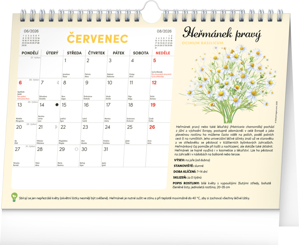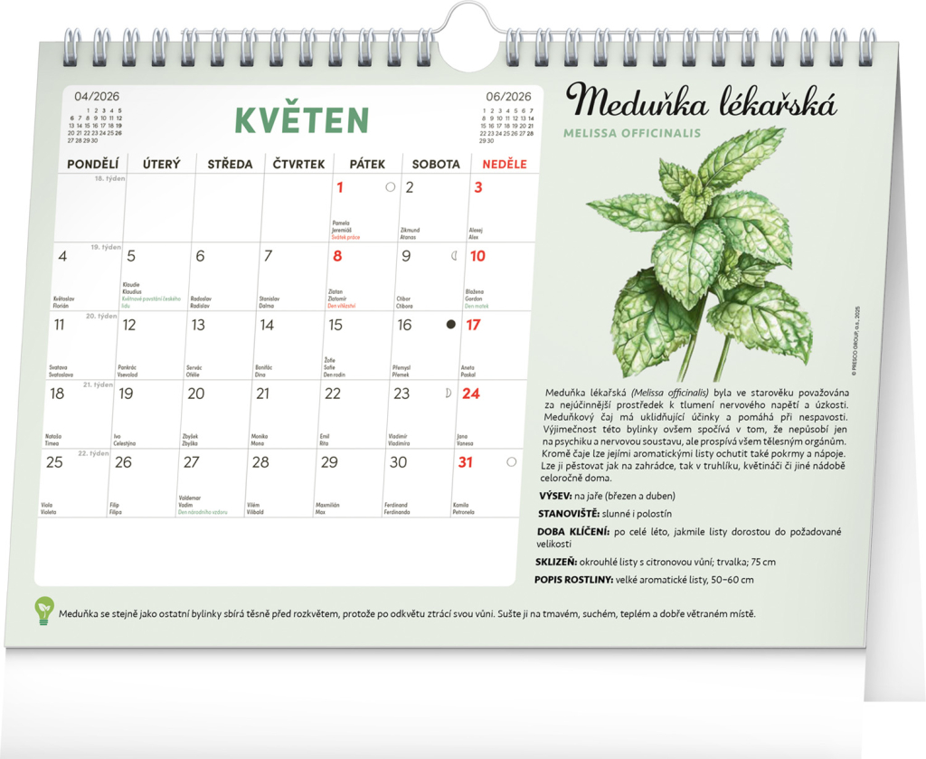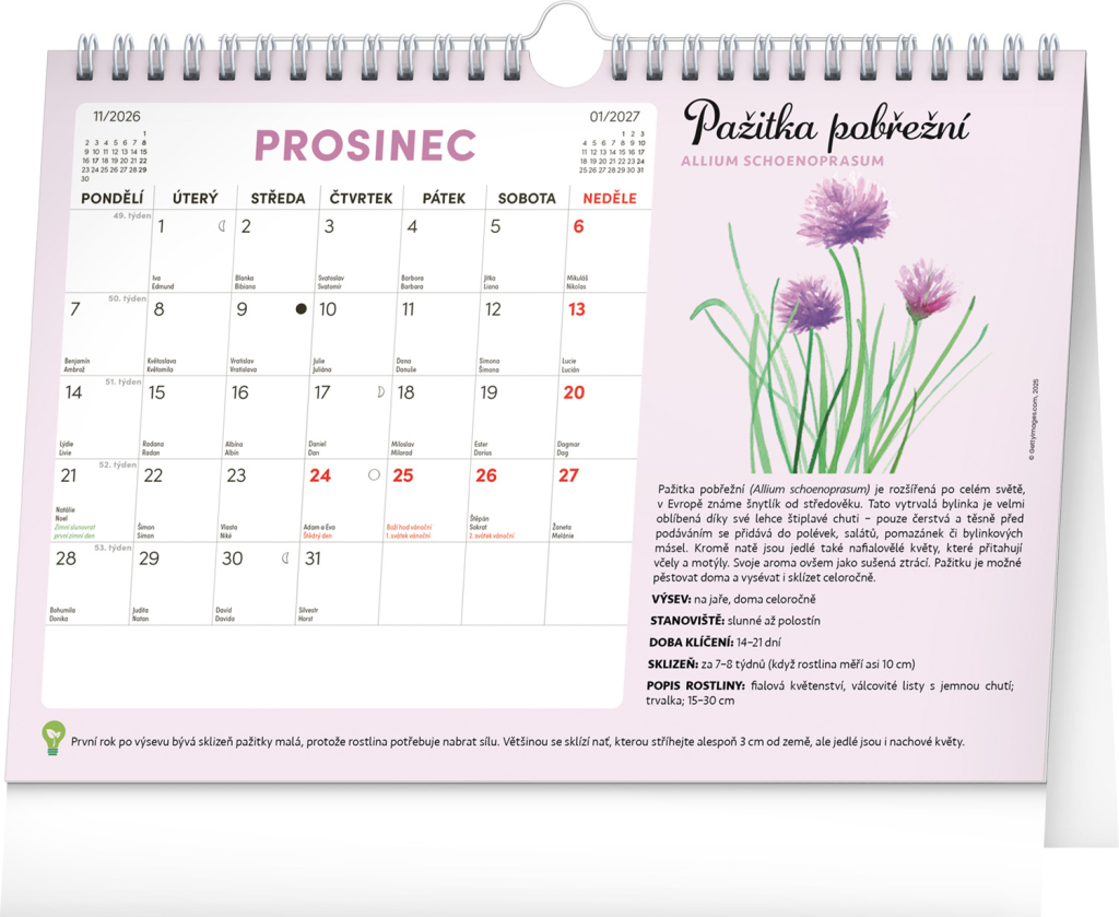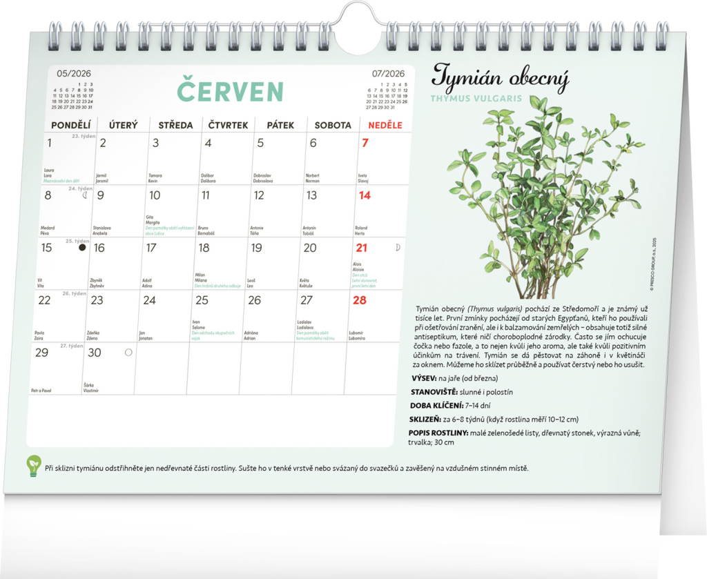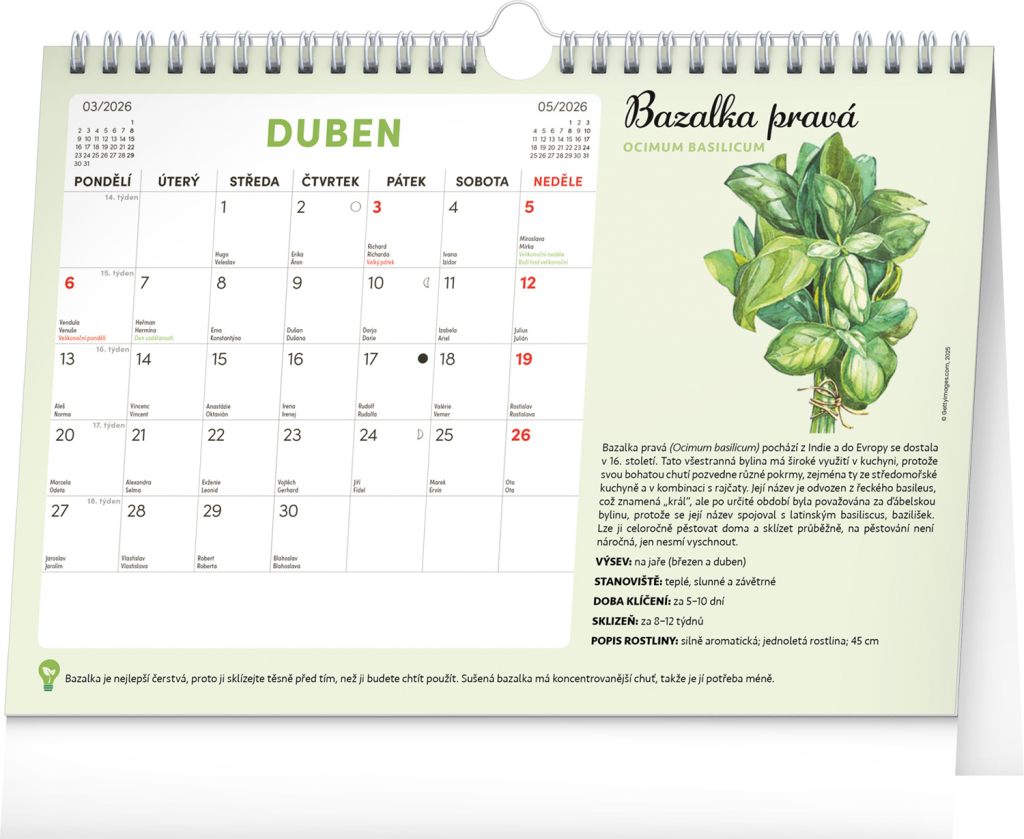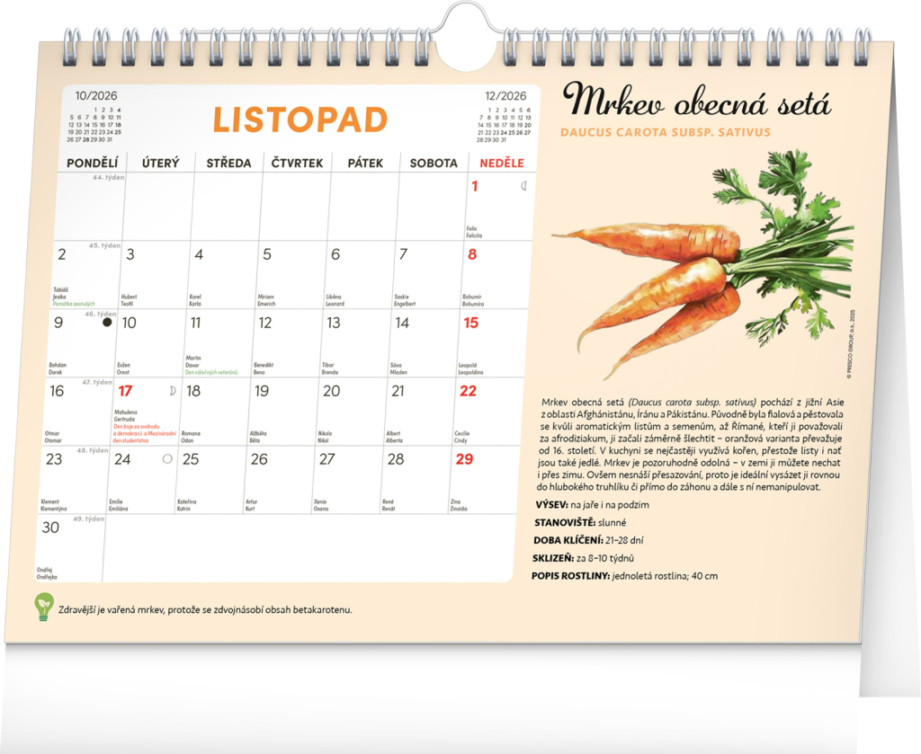 Objevte jedinečný stolní kalendář, který vám každý měsíc nabídne nejen dostatek prostoru na poznámky, ale i semínka rostlin, jež si můžete snadno vypěstovat doma. Stačí zasadit speciální semínkový papír do hlíny, zalévat a sledovat, jak vám rostou rajčata, bazalka, meduňka a další bylinky či zelenina. Ideální pro všechny, kteří chtějí zažít radost z pěstování a mít kousek zahrádky přímo u sebe doma. Obahuje měsíční kalendárium s českými svátky a jmeninami a 12 archů speciálního papíru se semínky.