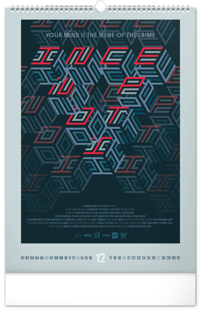 Nástěnný kalendář s alternativními filmovými plakáty od grafického designéra Olega Slepcoffa představuje originální pohled na slavné snímky jako Loupež po italsku, Pianista, Interstellar, Obvyklí podezřelí nebo Můj soused Totoro. Každý měsíc nabízí jedinečné grafické ztvárnění, které osloví milovníky filmu i designu. Kalendář je stylovým doplňkem každého interiéru.