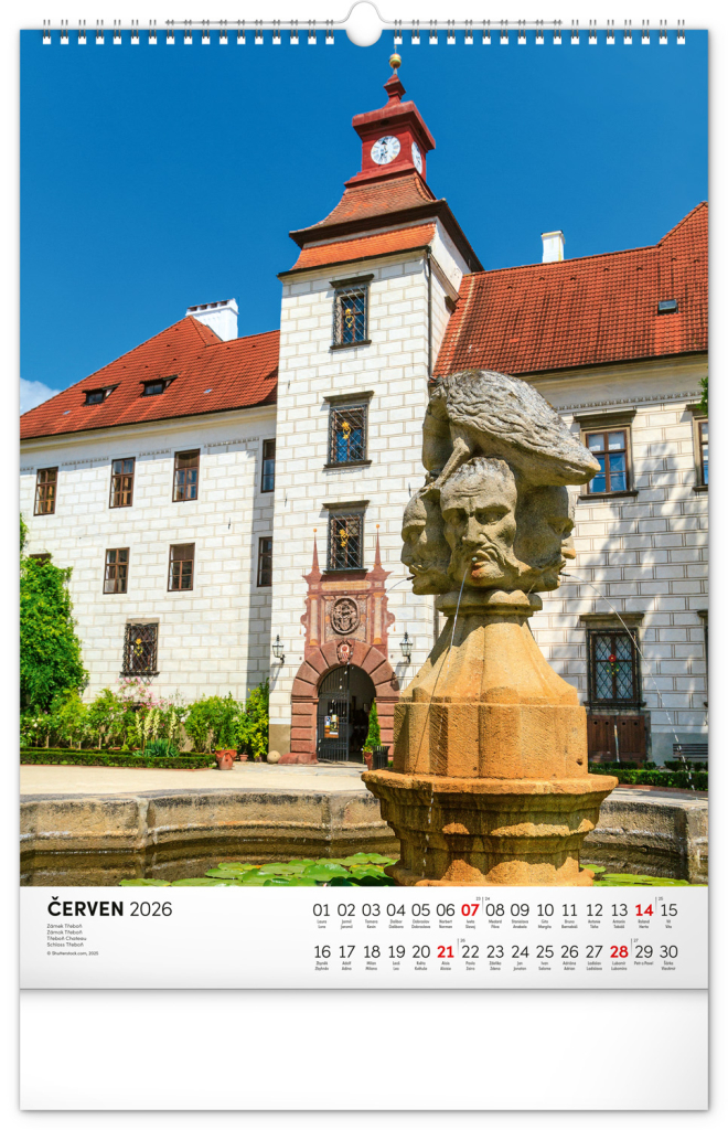 Barevné fotografie Lokte, Lednice, Hluboké či Bouzova na stránkách nástěnného kalendáře ve výškovém formátu. Jednoduché kalendárium s českými svátky a jmény.