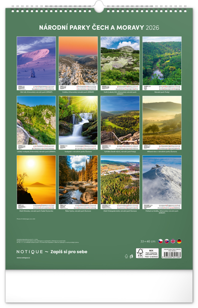 NOTIQUE Nástěnný kalendář Národní parky Čech a Moravy 2026, 33 x 46 cm