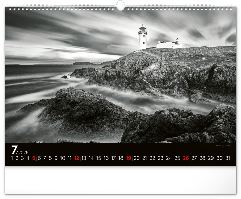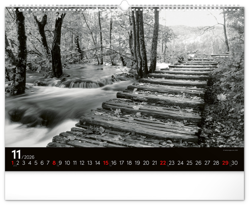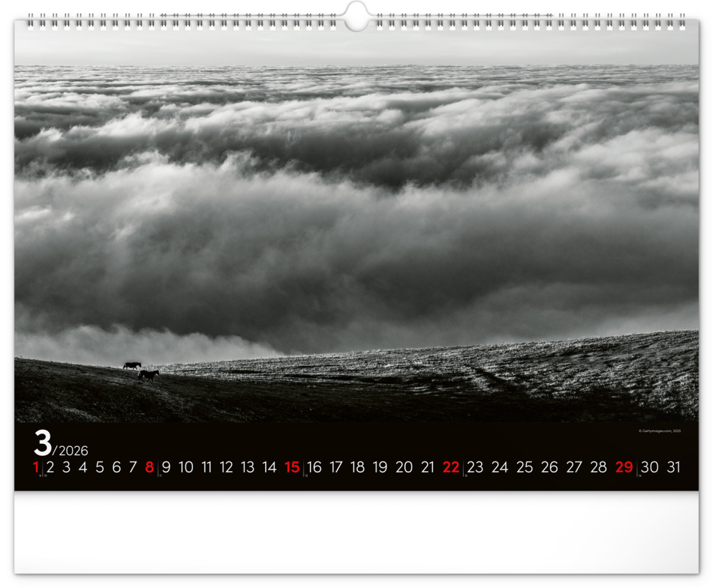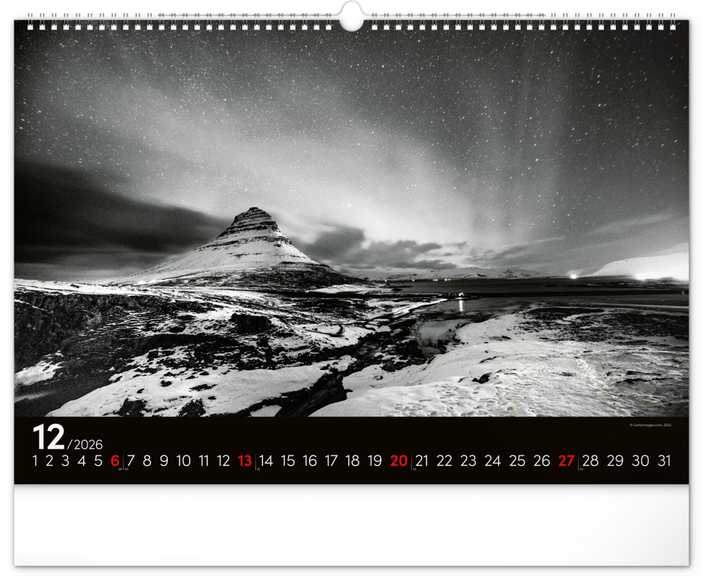 Zasněte se při pohledu na dvanáct úchvatných snímků krajiny v černobílém hávu. Jednoduché kalendárium na černém pozadí.