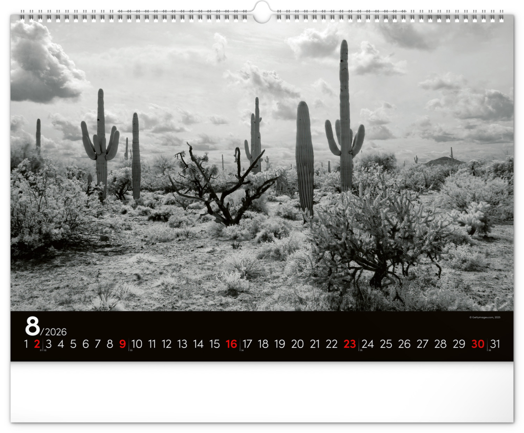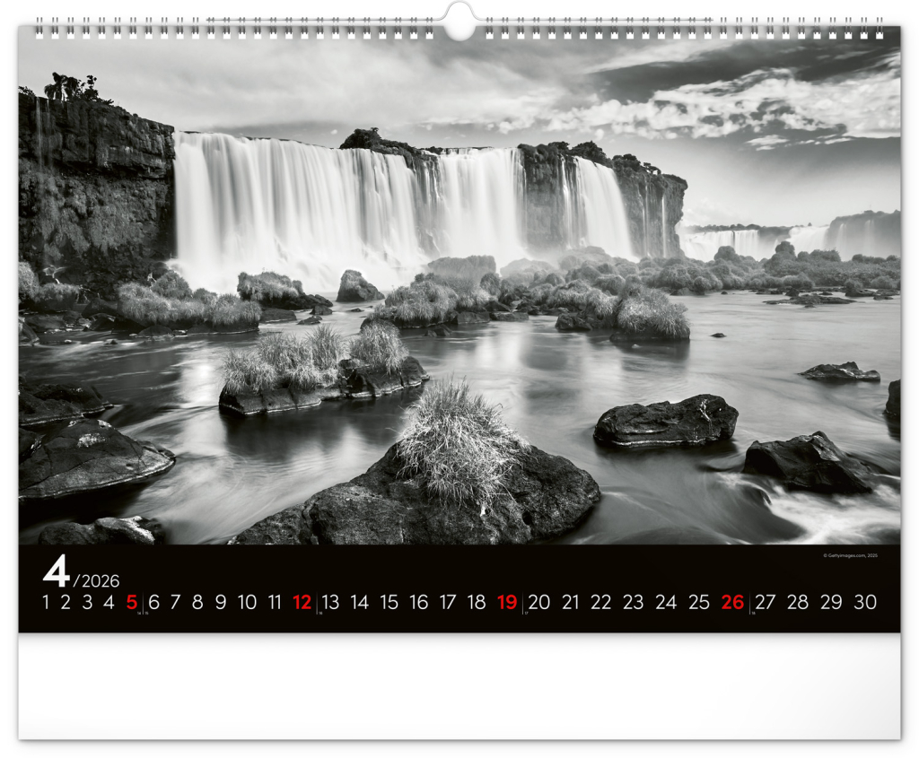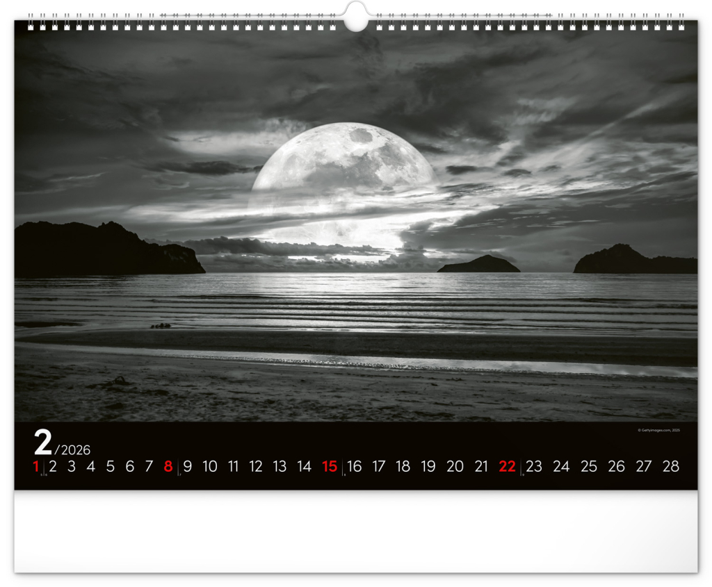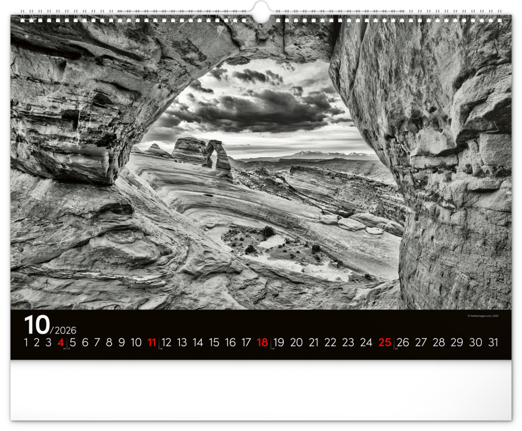 Zasněte se při pohledu na dvanáct úchvatných snímků krajiny v černobílém hávu. Jednoduché kalendárium na černém pozadí.