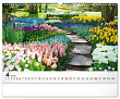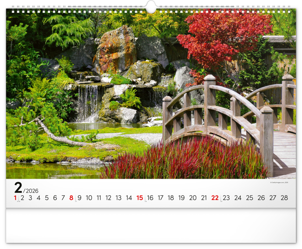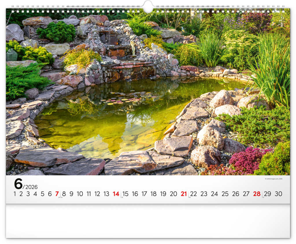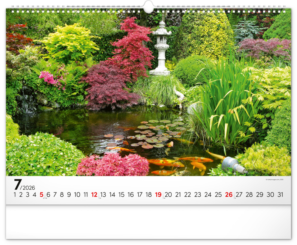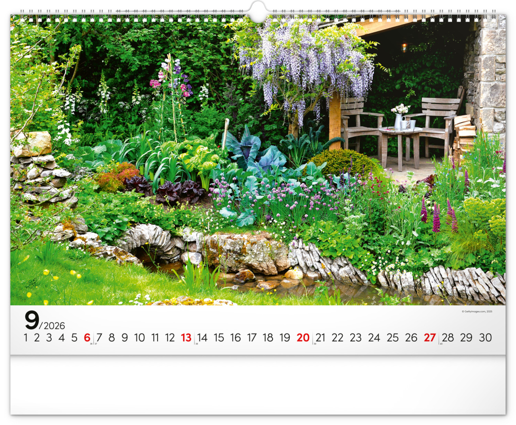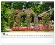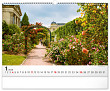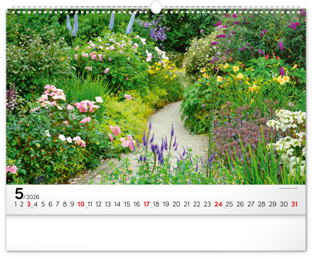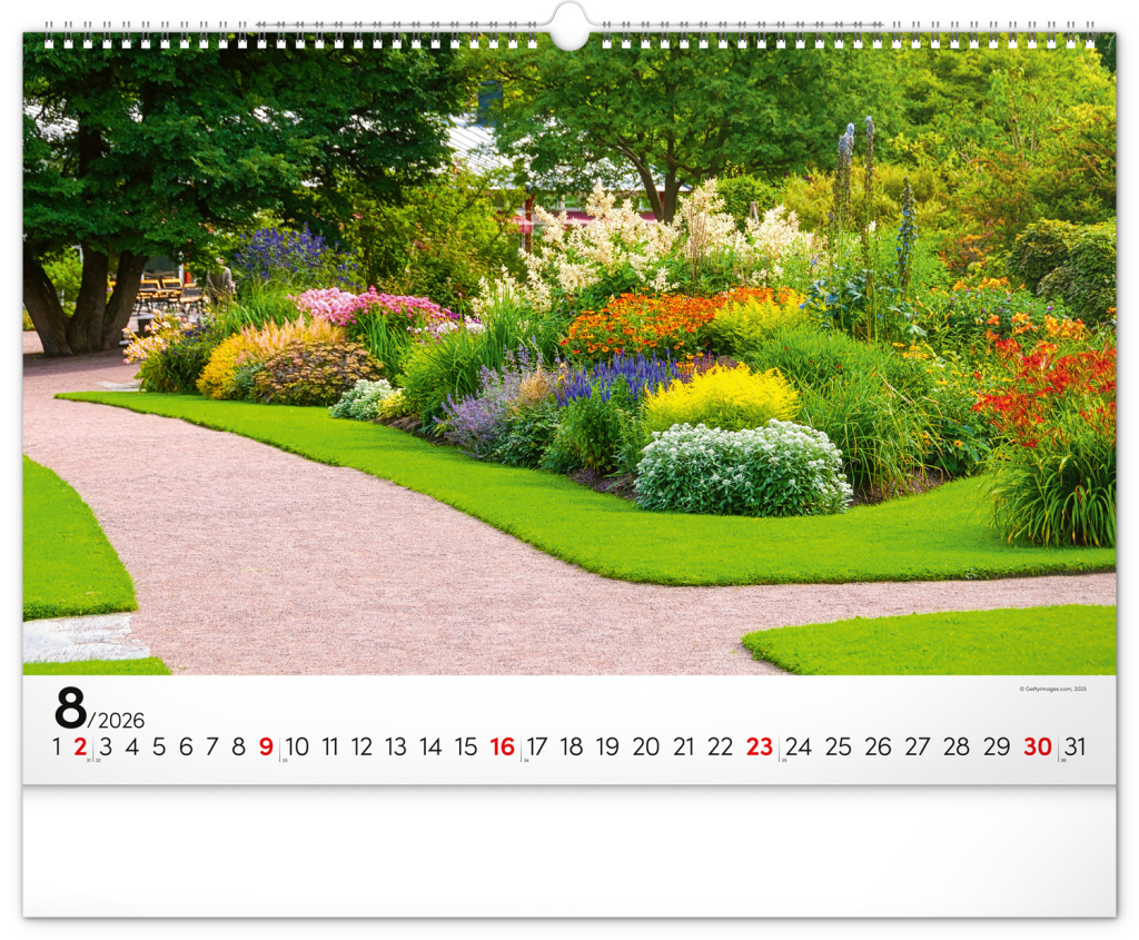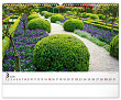 Dvanáct snímků zachycujících pomíjivou krásu květin v zahradách. Vy si však budete pohledu na nádherné barevné zahrady užívat po celý rok. Zahrady, oázy klidu a relaxace v nástěnném kalendáři doplňuje univerzální kalendárium se zvýrazněnými nedělemi na černém pozadí.