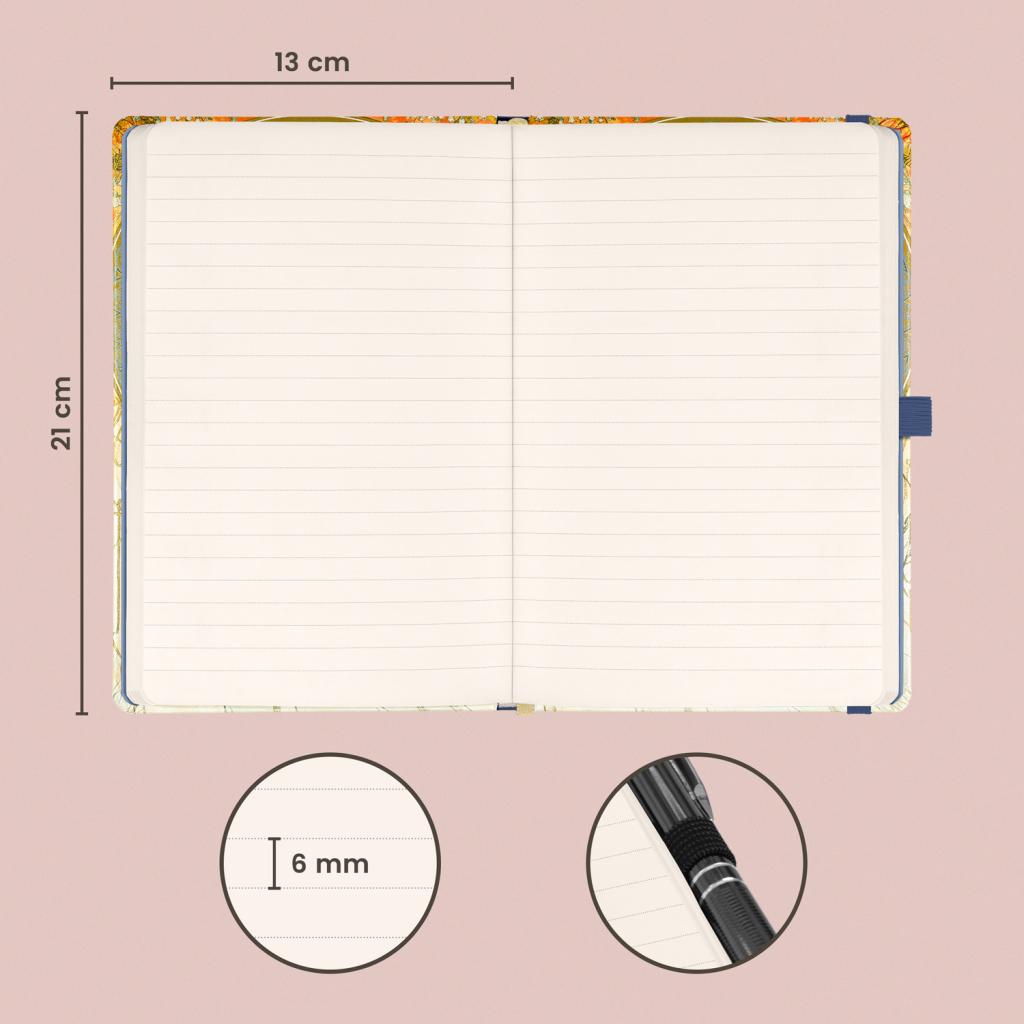 Kvalitní linkovaný notes v pevných deskách s uzavíráním na gumičku, poutkem na tužku a vnitřní kapsou na drobnosti. Uvnitř najdete 172 tečkovaných stran na žlutém papíře pro zapsání všech vašich nápadů. Linkovaný zápisník můžete použít jako deník, psát do něj hluboké myšlenky nebo pracovní poznámky.