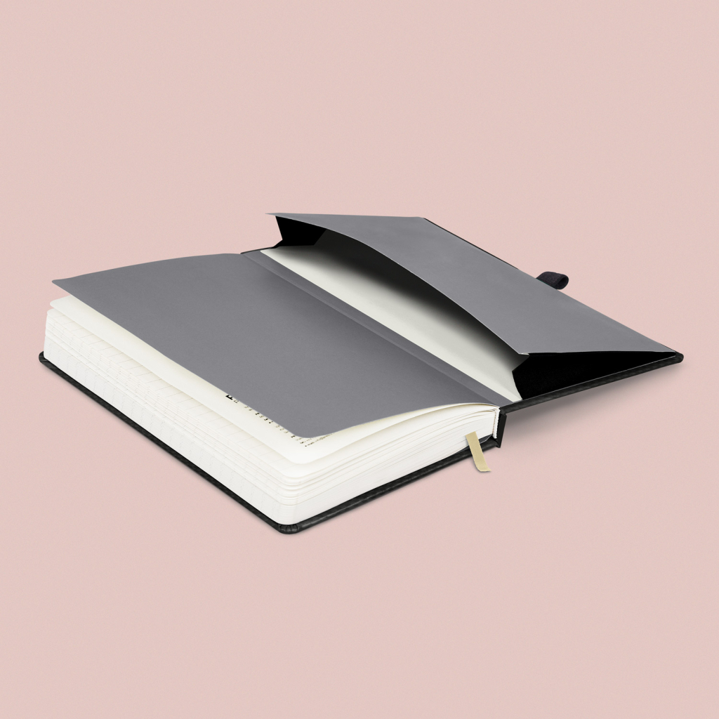 Kvalitní linkovaný notes v pevných deskách s uzavíráním na gumičku, poutkem na tužku a vnitřní kapsou na drobnosti. Uvnitř najdete 172 tečkovaných stran na žlutém papíře pro zapsání všech vašich nápadů. Linkovaný zápisník můžete použít jako deník, psát do něj hluboké myšlenky nebo pracovní poznámky.