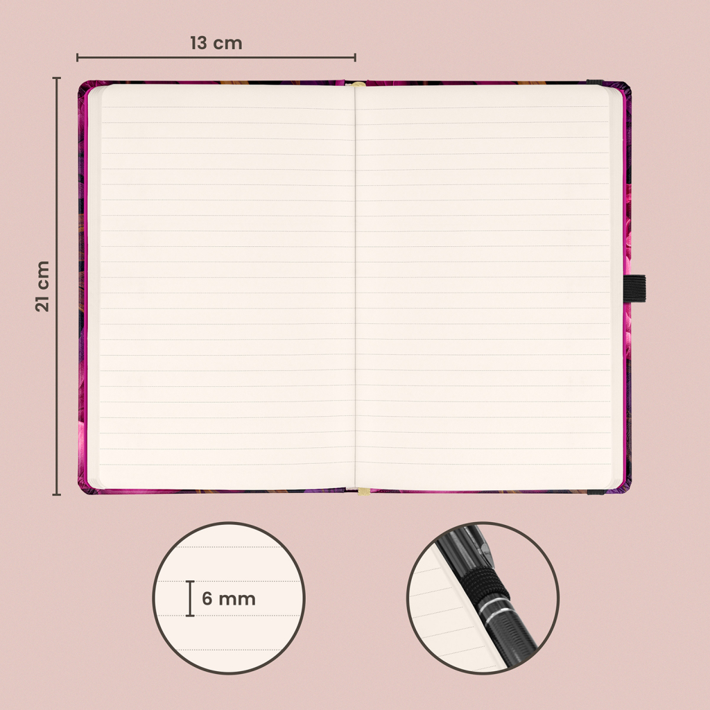 Kvalitní linkovaný notes v pevných deskách s uzavíráním na gumičku, poutkem na tužku a vnitřní kapsou na drobnosti. Uvnitř najdete 172 tečkovaných stran na žlutém papíře pro zapsání všech vašich nápadů. Linkovaný zápisník můžete použít jako deník, psát do něj hluboké myšlenky nebo pracovní poznámky.