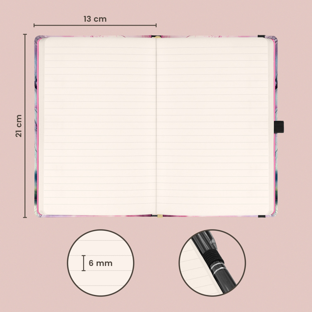 Kvalitní linkovaný notes v pevných deskách s uzavíráním na gumičku, poutkem na tužku a vnitřní kapsou na drobnosti. Uvnitř najdete 172 tečkovaných stran na žlutém papíře pro zapsání všech vašich nápadů. Linkovaný zápisník můžete použít jako deník, psát do něj hluboké myšlenky nebo pracovní poznámky.