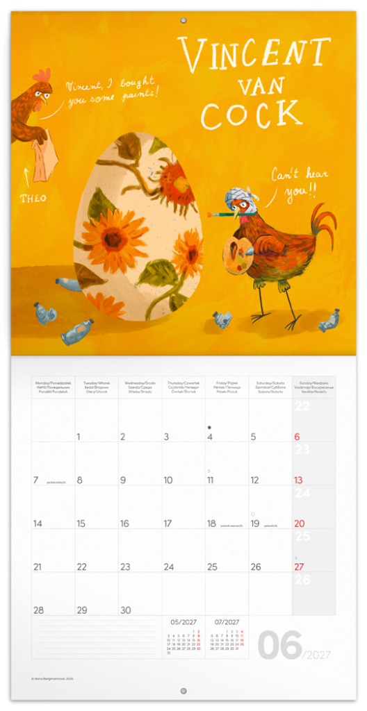 Poznámkový kalendář s propracovanými ilustracemi známých umělců ztvárněných jako kuřata od umělkyně Anny Bergmannové. V kalendáři kromě ilustrací najdete přehledné kalendárium od září 2026 do prosince 2027 v šesti jazycích, měsíční fáze, důležité svátky a prostor pro poznámky na každý den.| EAN | 8595689368234 |