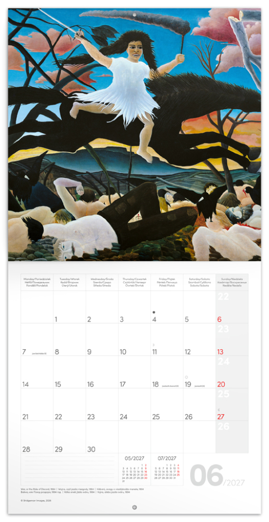 Poznámkový kalendář s výběrem obrazů ikonického francouzského malíře Henriho Rousseaua. Obsahuje přehledné kalendárium od září 2026 do prosince 2027 v šesti jazycích, měsíční fáze, důležité svátky a prostor pro poznámky na každý den.| EAN | 8595689369941 |